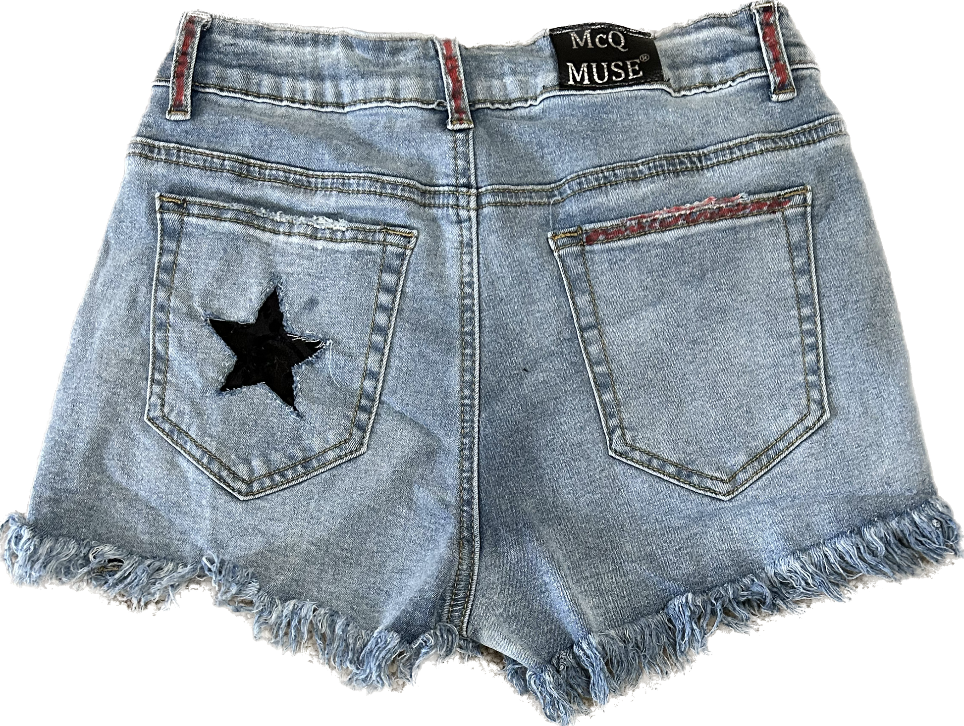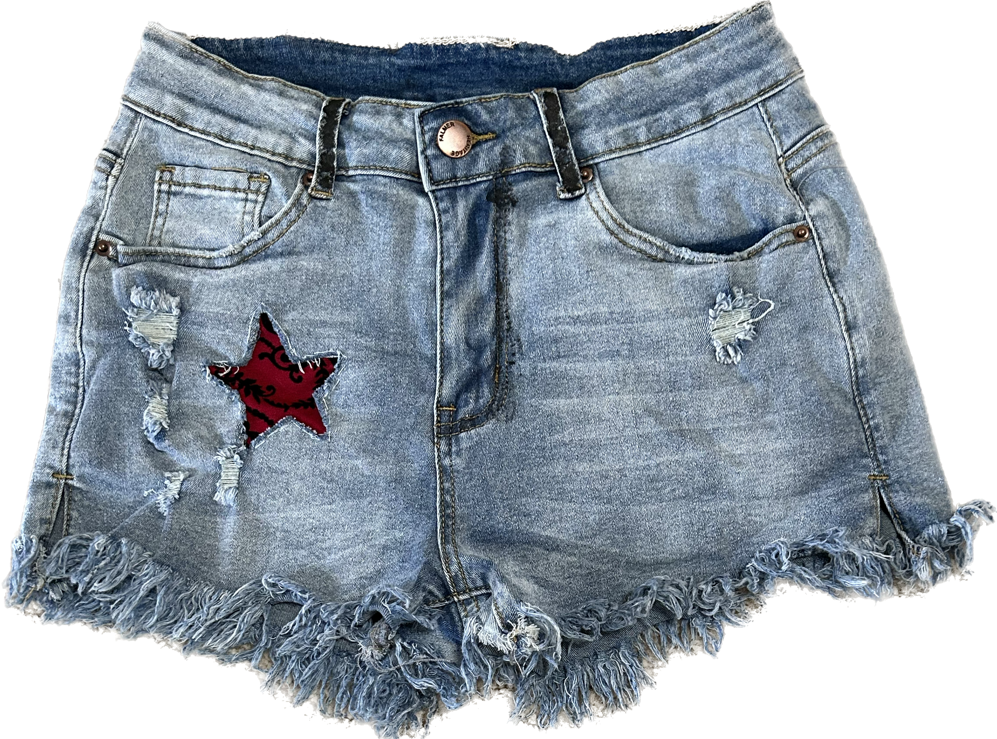 Light Blue, Mid-Rise Frayed Denim Shorts from the RockStar-U Line.