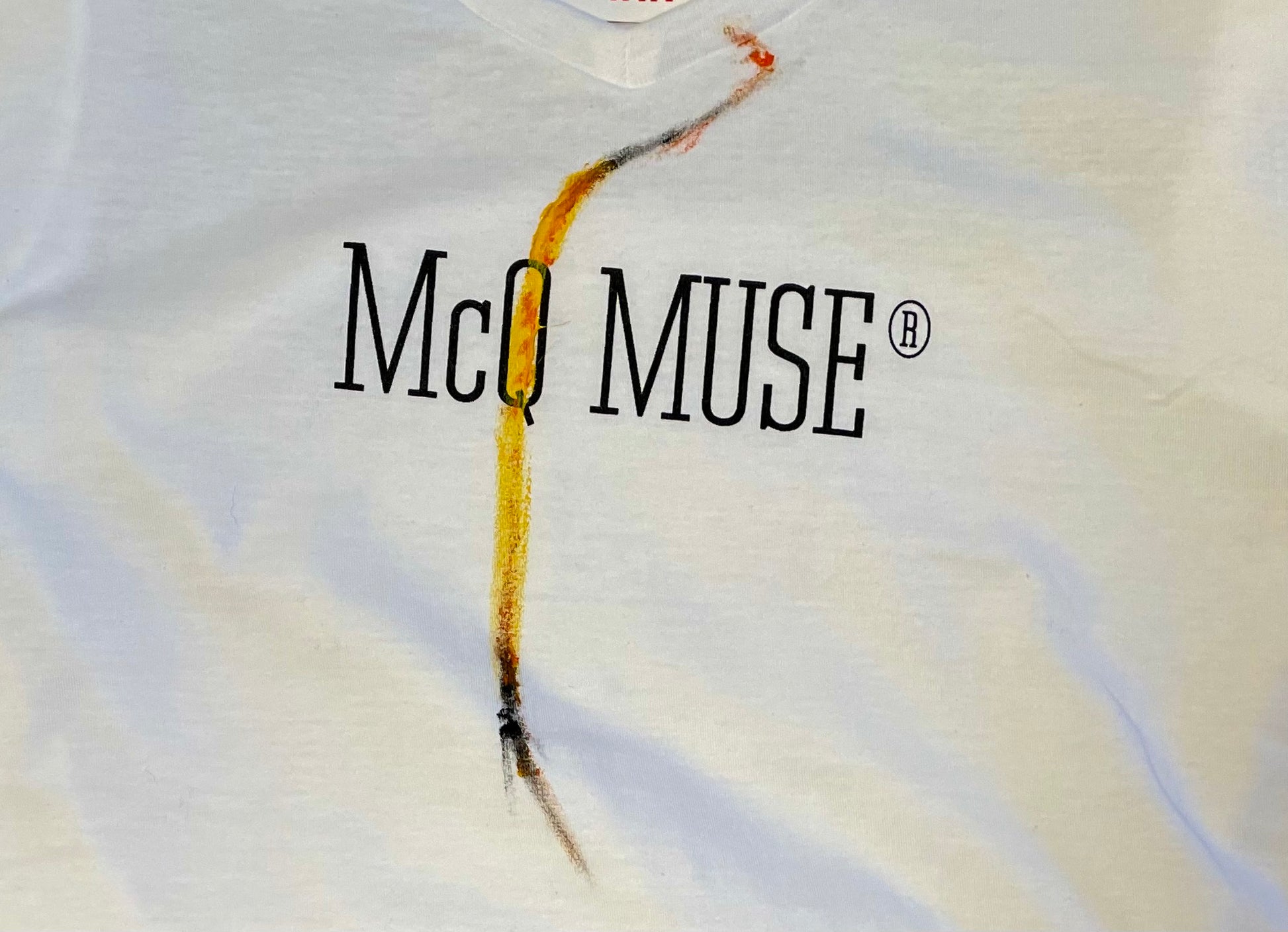This garment is from the McQ MUSE® Star-33 designer gallery, hand painted, cut, sewn and distressed. Each article of clothing is one of a kind and unique. They should be dry cleaned or hand washed and laid flat to dry.